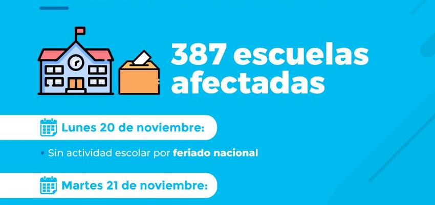 El Ministerio de Educación del Chaco, a través de la Dirección General de Gestión Educativa, informó que aquellas escuelas afectadas a los comicios del domingo 19 de noviembre no tendrán actividades escolares el martes 21, en el turno mañana, dado que el personal de mantenimiento realizará las tareas de limpieza e higiene de las aulas y de los sanitarios.