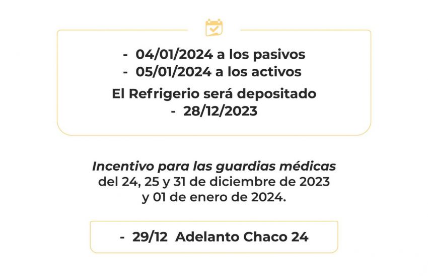 • El cronograma de sueldos implica abonar el día 4 de enero de 2024 a los pasivos y el día 5 de enero de 2024 a los activos.