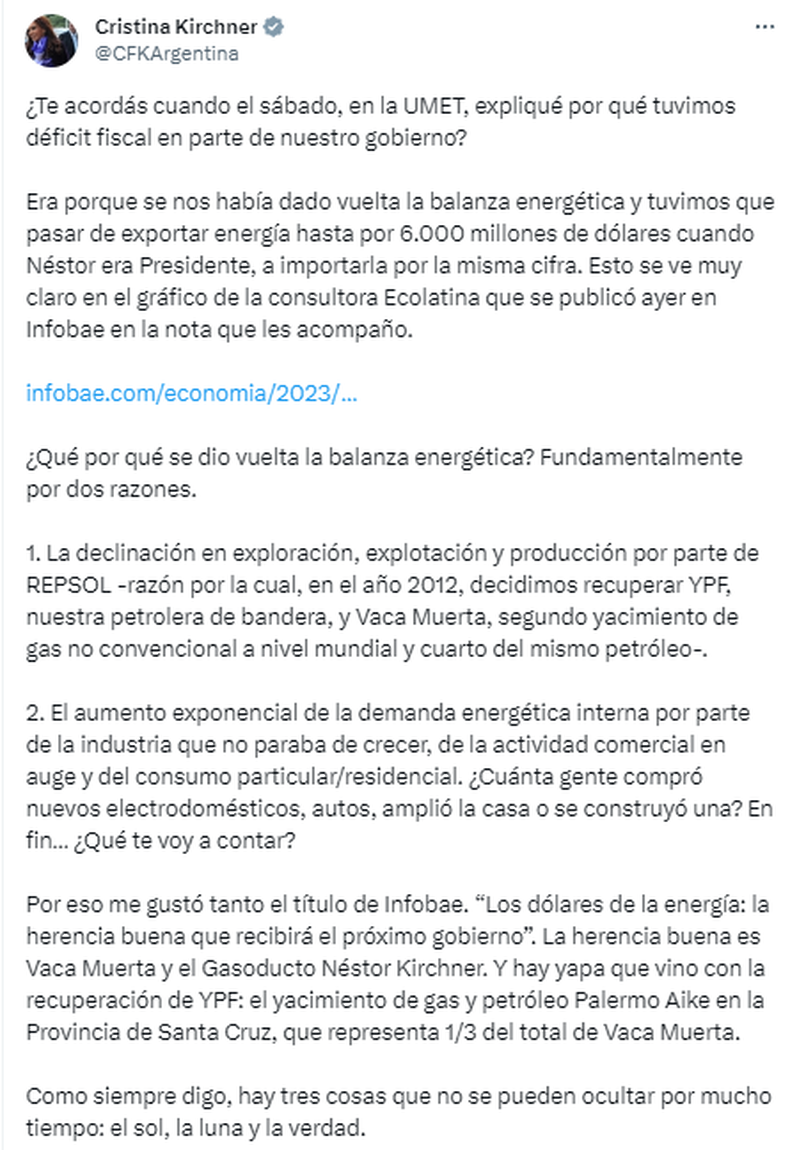 Ante esa situación, la exmandataria destacó el titulo de la nota de Porcella “Los dólares de la energía: la herencia buena que recibirá el próximo gobierno” e indicó que «la herencia buena es Vaca Muerta y el Gasoducto Néstor Kirchner». «Y hay yapa que vino con la recuperación de YPF: el yacimiento de gas y petróleo Palermo Aike en la Provincia de Santa Cruz, que representa 1/3 del total de Vaca Muerta», agregó.
