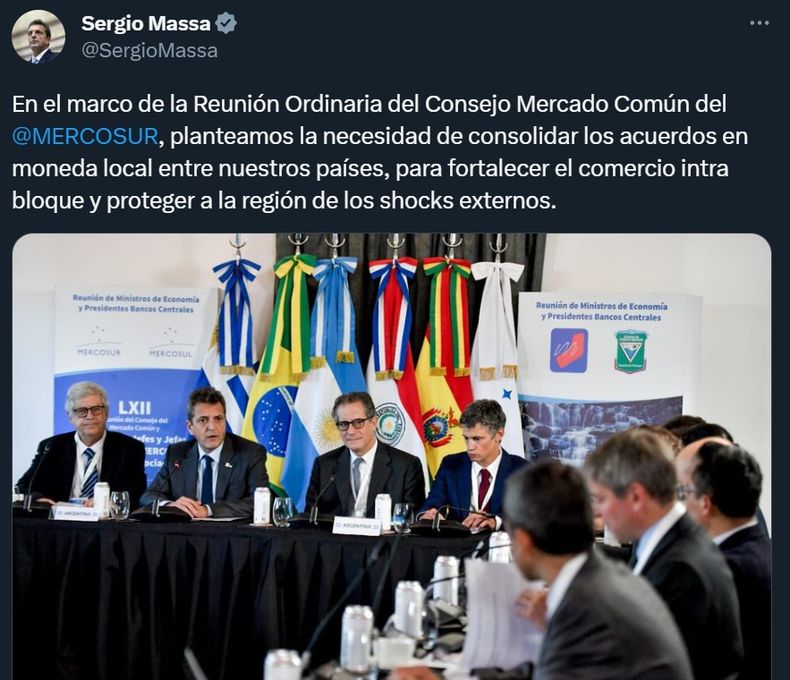 Durante su discurso, el titular del Palacio de Hacienda remarcó la relevancia de las monedas de cada país del bloque sudamericano: «Nos evita ser rehenes de los shocks externos y nos da mayor capacidad de desarrollo económico en la región, mucho más cuando entendemos que los temas de seguridad alimentaria y energética son parte de la agenda global de los próximos 10 años«.