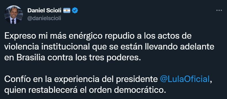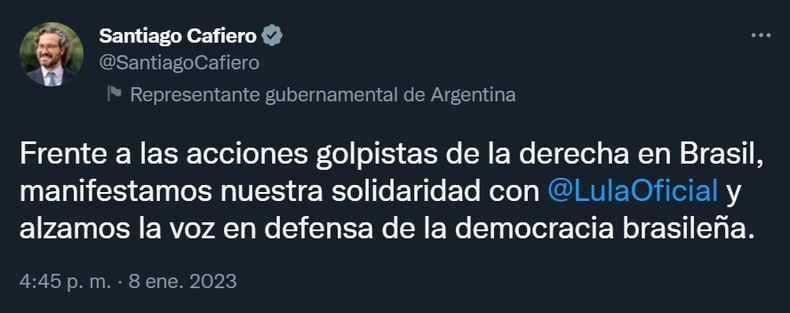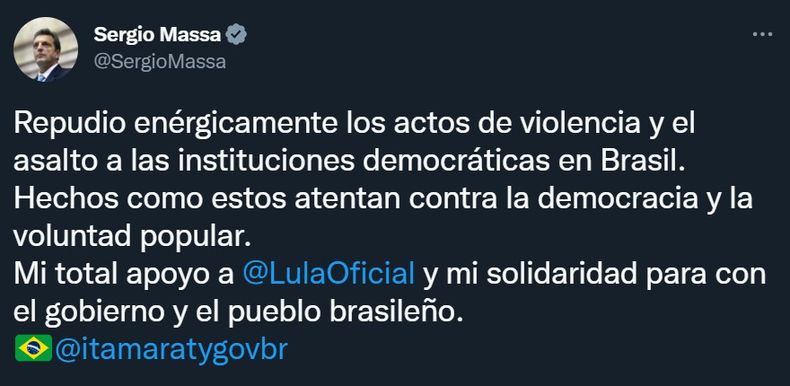 Las publicaciones de Cafiero, Massa y Scioli se debieron a la invasión de miles de partidarios bolsonaristas, que pretenden un golpe de Estado para derrocar a Lula, quien asumió por tercera vez en su historia el domingo pasado. Los grupos de la derecha de Brasil realizaron sus acciones sobre el Palacio del Planalto, el Congreso Nacional y el Supremo Tribunal Federal en Brasilia, prácticamente sin resistencia de la Policía.