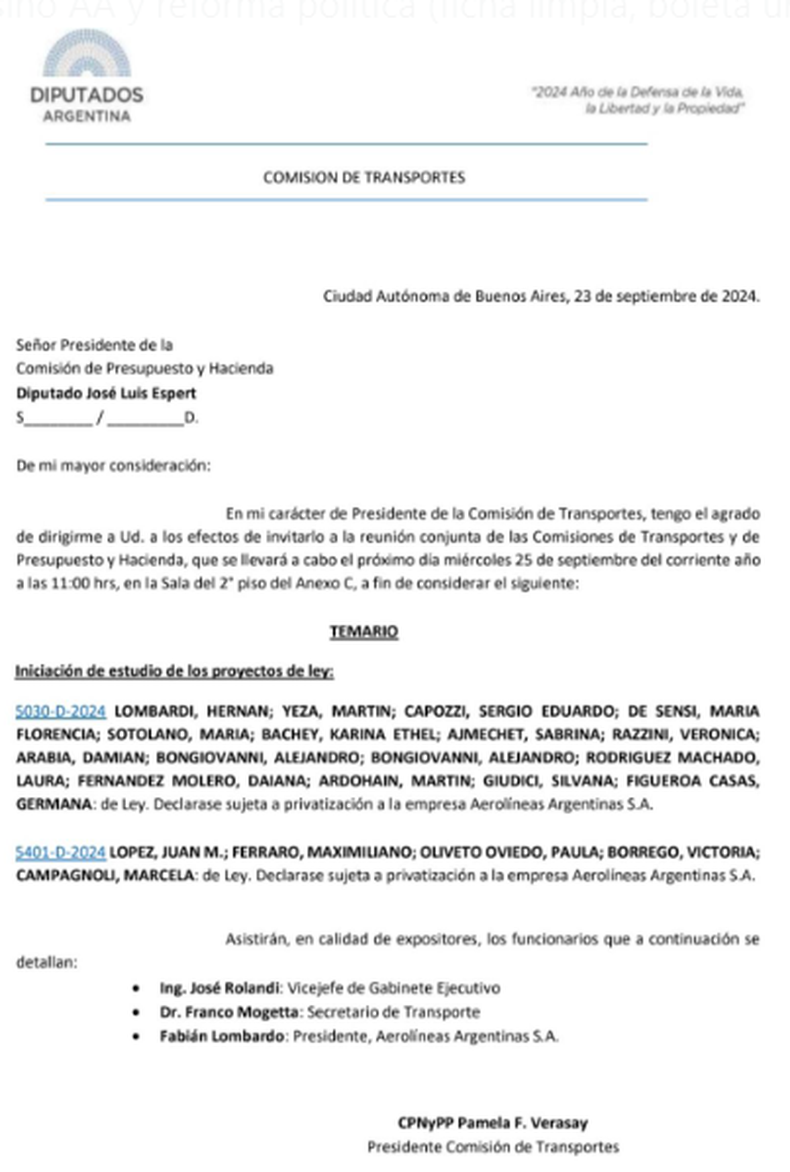 El oficialismo oficializó la citación para el miércoles a las 11 de un plenario de las comisiones de Transporte y de Presupuesto y Hacienda, que presiden la radical Pamela Verasay y el libertario José Luis Espert, respectivamente.