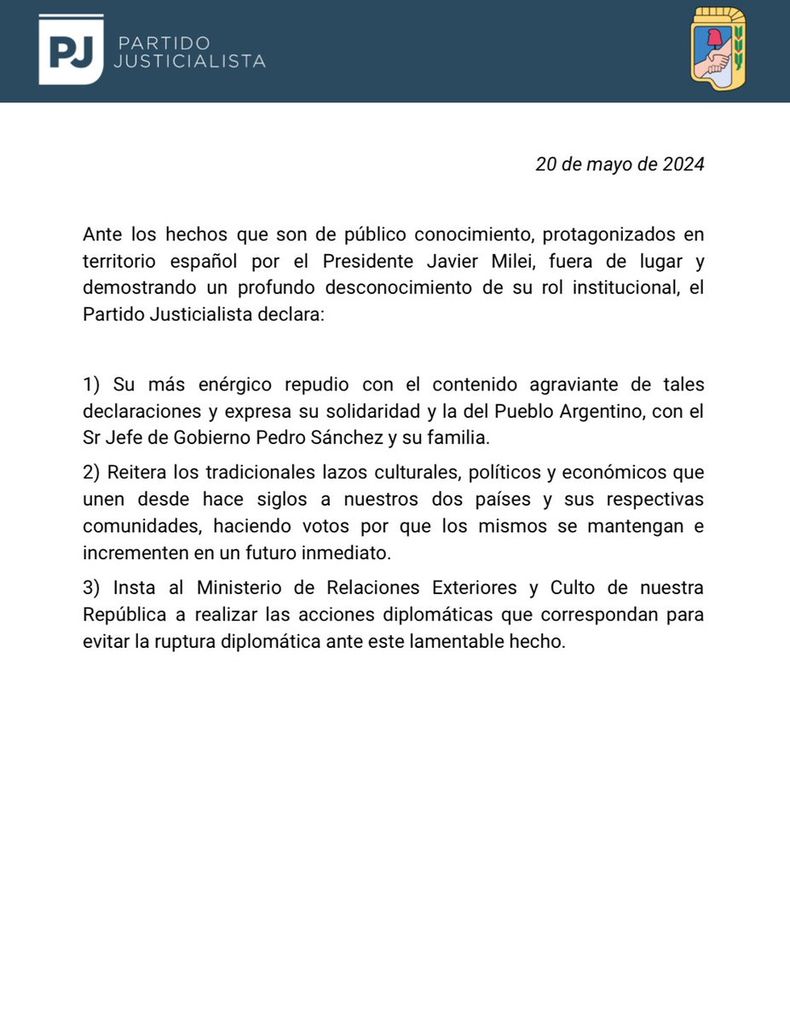 El peronismo expuso a través de un comunicado que el mandatario actuó «fuera de lugar y demostrando un profundo desconocimiento de su rol institucional» y luego manifestó su rechazo a lo ocurrido en España: «El PJ declara su más enérgico repudio con el contenido agraviante de tales declaraciones y expresa su solidaridad y la del Pueblo Argentino, con el señor Jefe de Gobierno Pedro Sánchez y su familia«.
