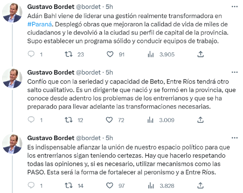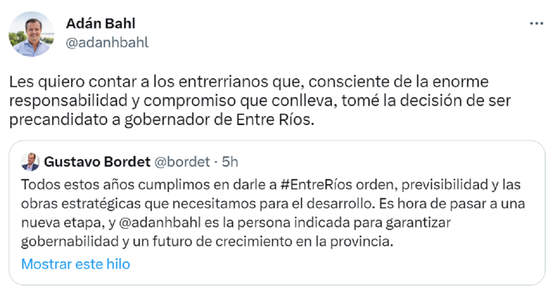 El intendente de Paraná y ahora precandidato por la gobernación de Entre Ríos, también confirmó que será parte de las próximas elecciones mediante su cuenta de Twitter: «Les quiero contar a los entrerrianos que, consciente de la enorme responsabilidad y compromiso que conlleva, tomé la decisión de ser precandidato a gobernador de Entre Ríos».