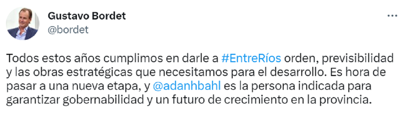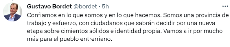 Por otro lado, Bordet remarcó que durante sus ocho años de gestión hubo «orden, previsibilidad y obras estratégicas de desarrollo» pero «es hora de pasar a una nueva etapa».
