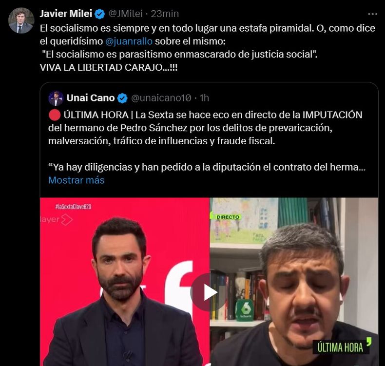 Por lo pronto, el economista libertario nuevamente cuestiona a Sánchez y se enfocó en la agenda exterior antes de que el miércoles emprenda el viaje a Italia, donde se llevará a cabo una cumbre del G7. De esta manera, Victoria Villarruel se hará cargo del Poder Ejecutivo y Bartolomé Abdala, el presidente provisional del Senado, encabezará la sesión de la Ley Bases y el paquete fiscal.