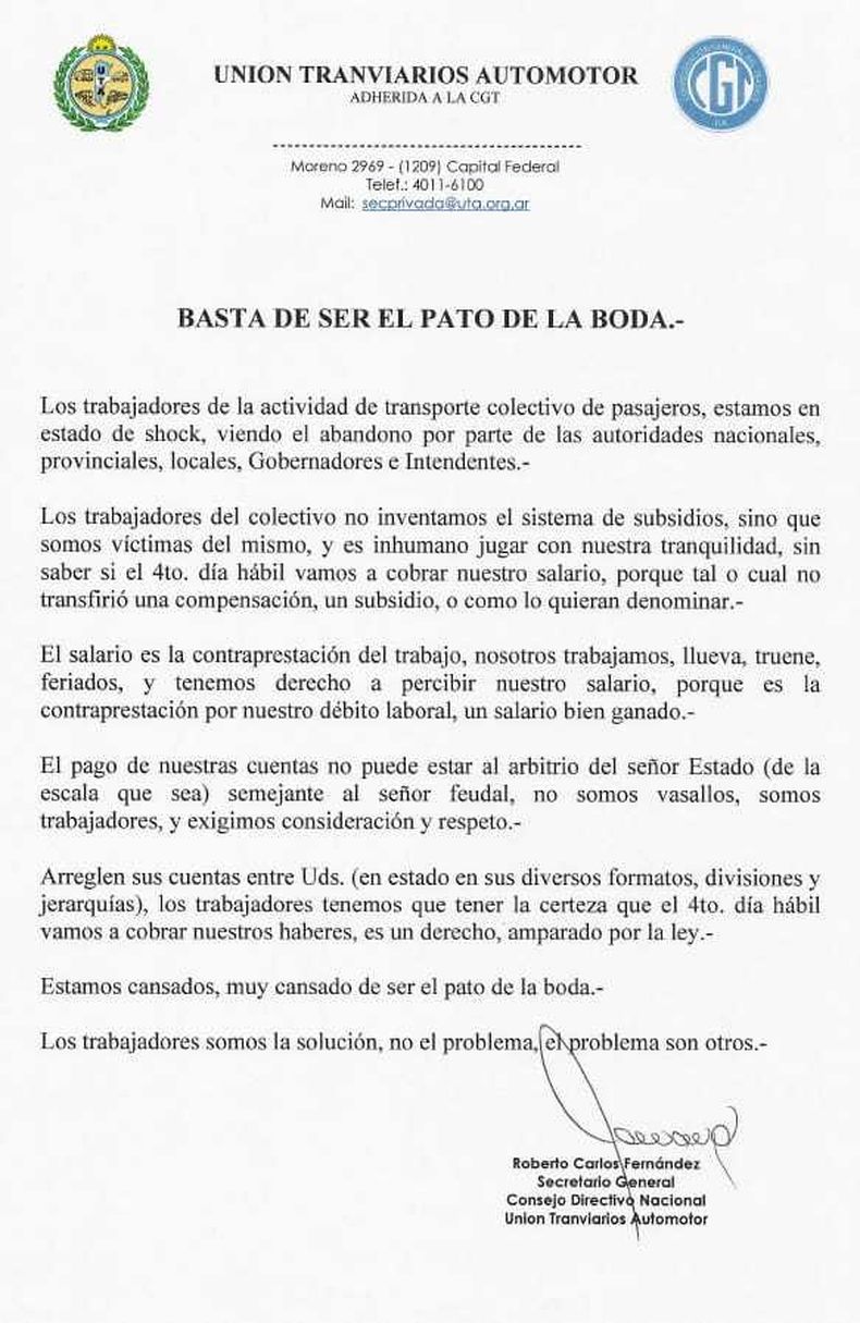 «El pago de nuestras cuentas no puede estar al arbitrio del señor Estado semejante al señor feudal, no somos vasallos, somos trabajadores, y exigimos consideración y respeto», aseguró el sindicato por intermedio de un documento.