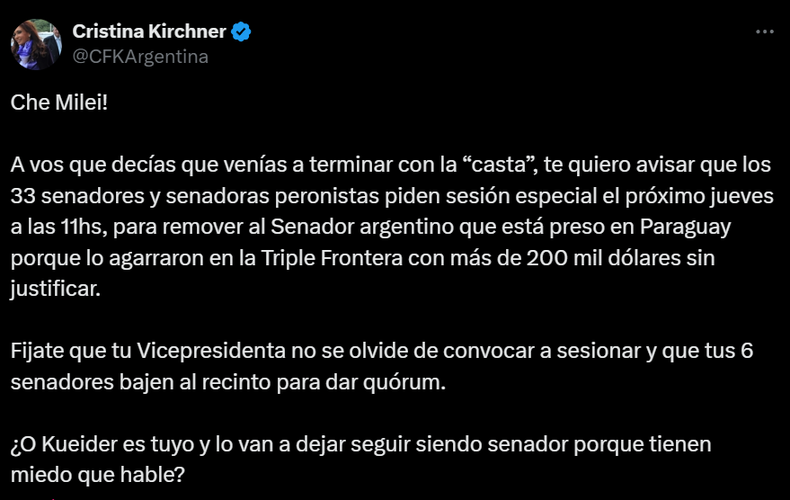 «Che Milei! A vos que decías que venías a terminar con la “casta”, te quiero avisar que los 33 senadores y senadoras peronistas piden sesión especial el próximo jueves a las 11hs, para remover al Senador argentino que está preso en Paraguay porque lo agarraron en la Triple Frontera con más de u$s200 mil dólares sin justificar«, escribió en su cuenta de X.