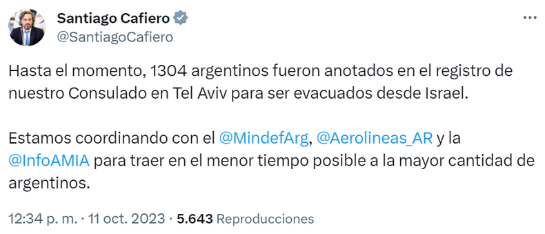 El canciller Santiago Cafiero anunció que hasta este miércoles al mediodía 1.304 argentinos se habían inscripto para ser repatriados desde Israel. El avión Hércules C-130 de la Fuerza Aérea Argentina que se utilizará en el operativo partió este martes desde El Palomar y llegará esta noche a Tel Aviv.