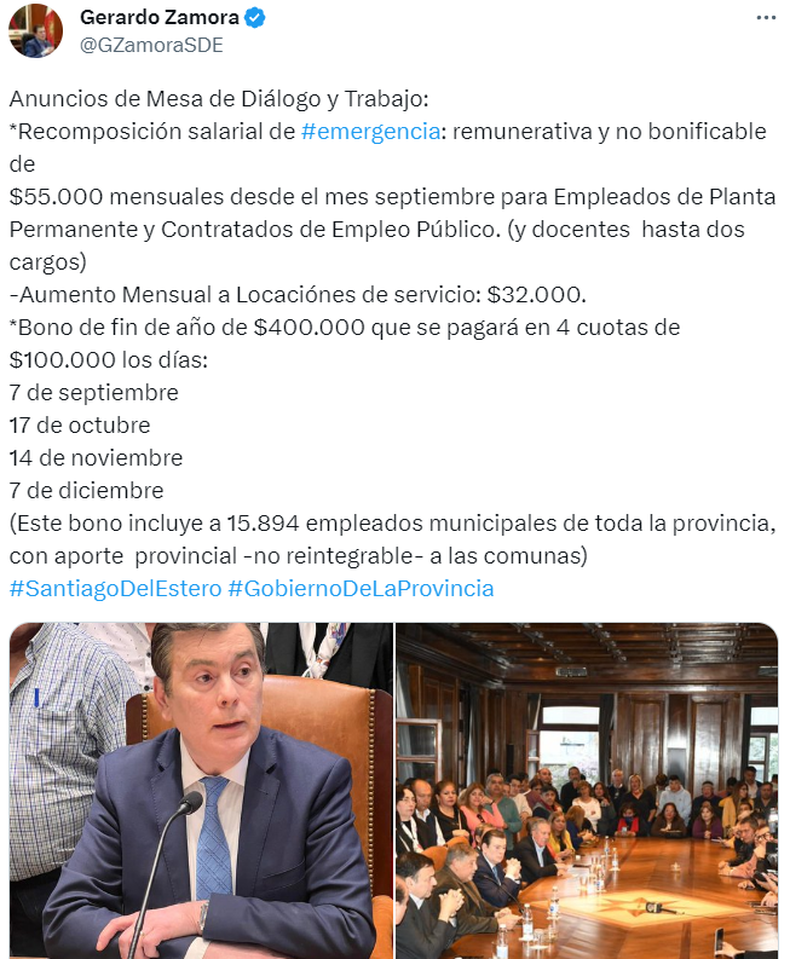 En el caso de La Rioja, el gobernador Ricardo Quintela anunció la entrega de una suma fija de 55 mil pesos y un incremento del 5% en el sueldo básico para los trabajadores públicos de esa provincia, para acompañar los recientes anuncios del Gobierno nacional.
