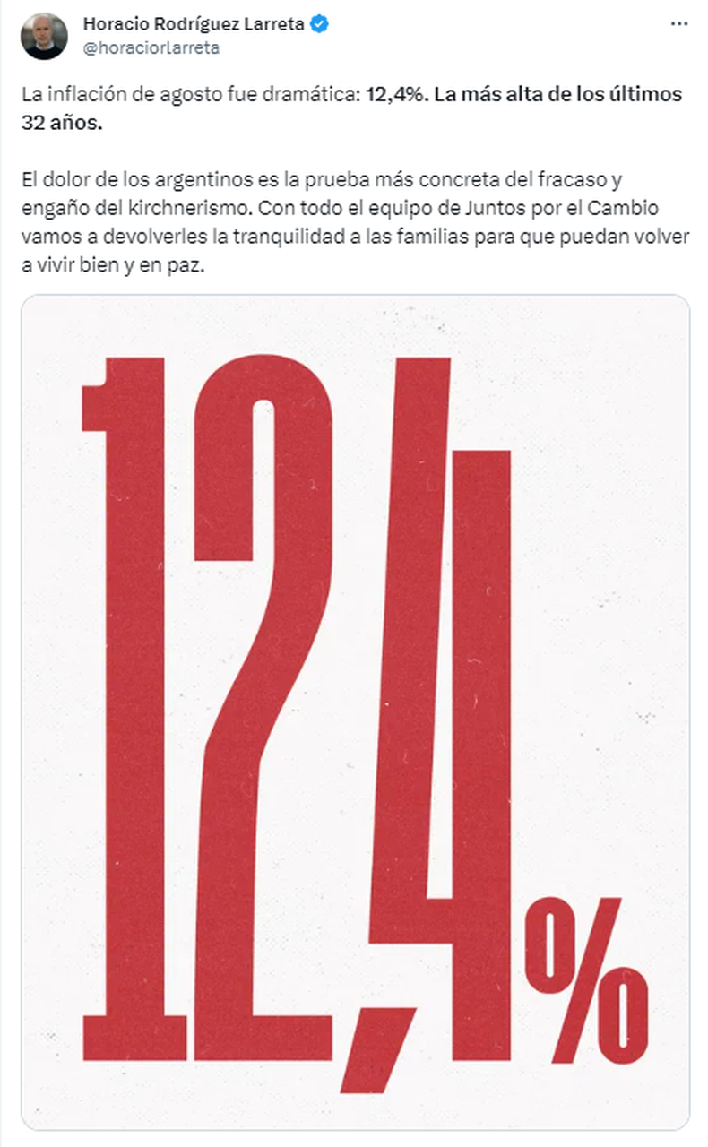 Luego de que el Instituto Nacional de Estadística y Censos (Indec) informara este miércoles que el Índice de Precios al Consumidor (IPC) aumentó un 12,4% en agosto, varios referentes de la oposición expresaron su opinión y criticaron al Gobierno nacional.